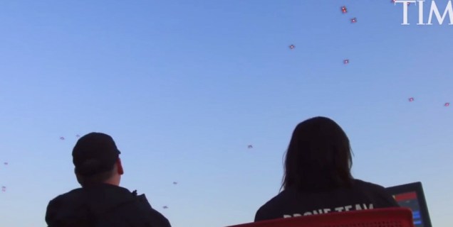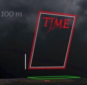 Und schon fliegen 958 Drohnen im dichten Schwarm, um ein 100 Meter hohes Time-Titelbild im charakteristischen Rot des Magazins darzustellen. Fotografiert wird das Spektakel von einer weiteren Drohne mit Kamera, die das Foto aus dem gewünschten Winkel erstellte.