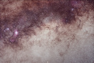 Das Herz der Milchstraße, unserer Galaxie. Zahlreiche Dunkelnebel verdecken die dahinter liegenden Sterne. Gasnebel leuchten rot (der markanteste ist links M8, der Lagunennebel). Aufgenommen in Südafrika.