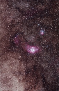 Nahaufnahme zweier bekannter Nebel. In der Bildmitte der große Lagunennebel (M8), darüber der kleinere Trifidnebel (M20). Der Lagunennebel ist ein reiner Gasnebel, der Trifidnebel besteht aus einem Gasteil (rot) und einem Reflektionsteil (blau).