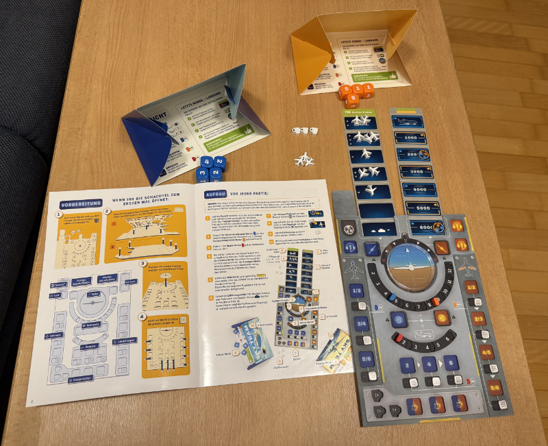 Dann würfeln beide Spieler. Von da an sitzen wir schweigend, ohne miteinander zu kommunizieren da. Es wird nur mehr verdeckt gewürfelt und darauf gehofft, dass man die Landung erfolgreich hinbekommt oder der jeweils andere durch seine Spielzüge das Flugzeug zum Absturz bringt.