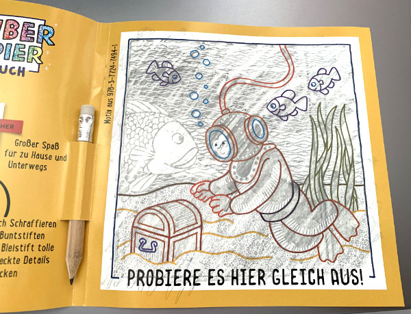 Nette Idee: das Zauberpapier Malbuch. erst durchs Schraffieren mit einem Bunt- oder Bleistift lassen sich weitere Zeichnungen entdecken.