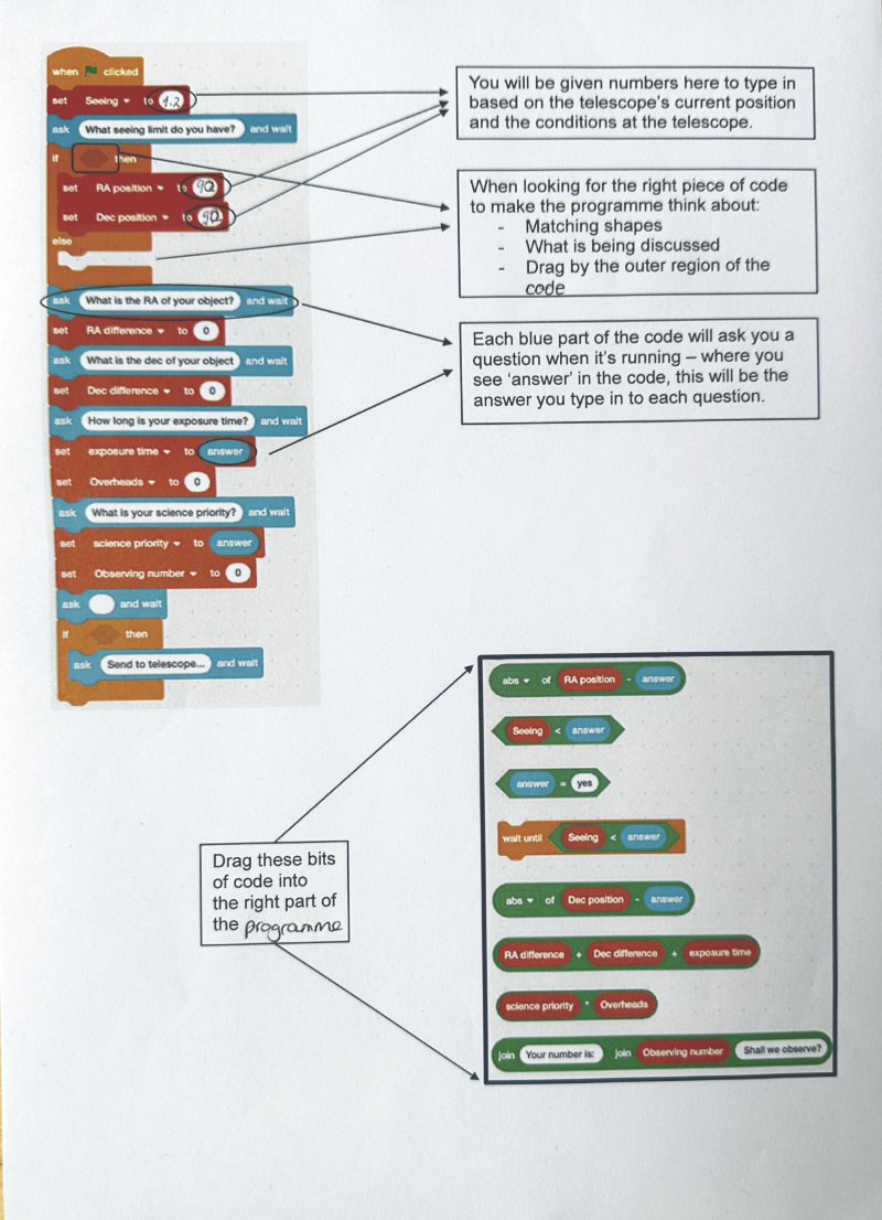 Nun sollen wir also den Code programmieren, damit sich das Roboterteleskop auf eine Galaxie unserer Wahl ausrichtet.