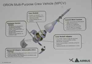 Orion ist Nasa’s künftiges Raumschiff für den Transport von Menschen. Es soll Menschen weiter als den Mond, bis zum Mars und zu Asteroiden sicher befördern können. Der europäische Anteil daran ist das ESM, das European Service Modul. Es liefert den Antrieb, den Strom, Wasser, Sauerstoff und Stickstoff und die Kontrolleinheiten für Temperatur und Navigation. (Siehe weiter unten.)