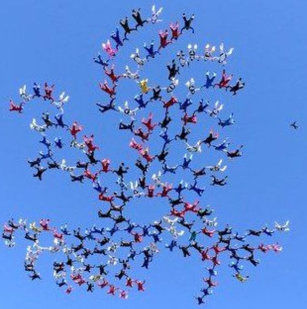Den derzeitigen Weltrekord im Relativspringen (alle Springer fassen sich im Freifall gleichzeitig an und bilden eine Formation (Figur) in der Luft) steht bei 400 Springern. Das ist nicht mehr leicht zu toppen.