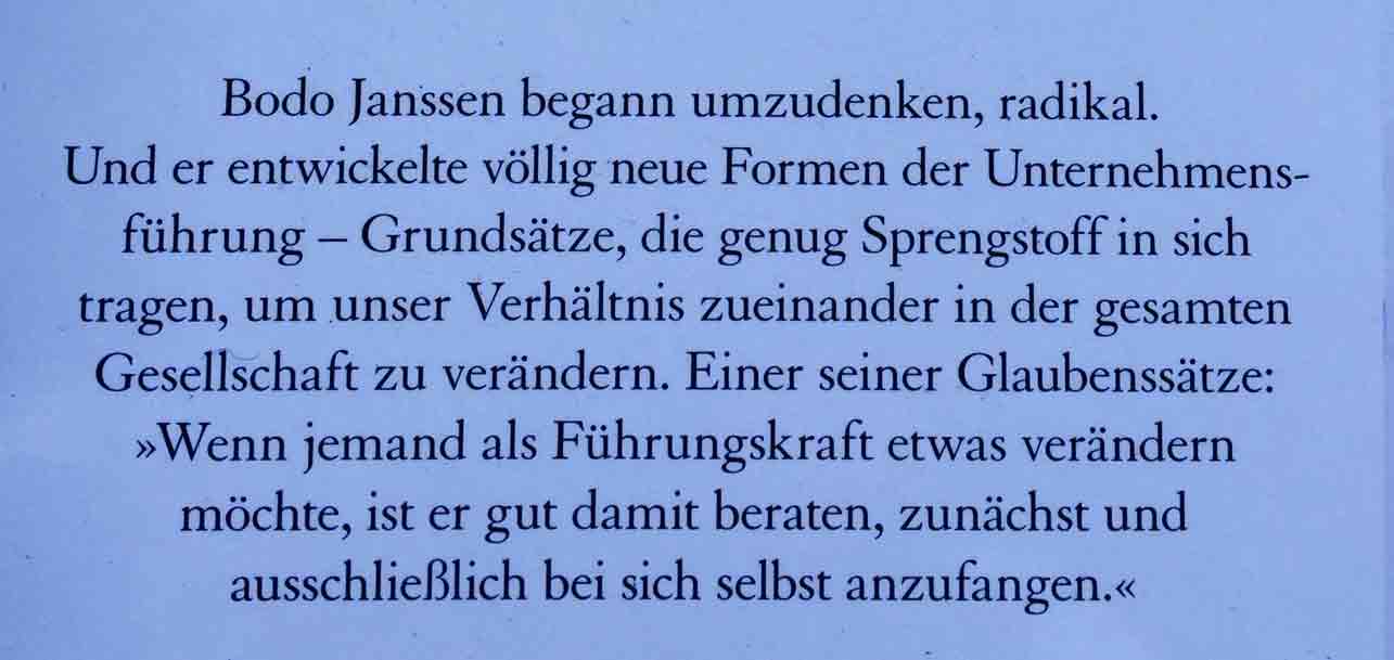 Einer, der zwar nicht aus der Luftfahrt kam, aber unerwartet ein recht großes Firmenimperium erbte, zunächst nach der herkömmlichen Führungsphilosophie herrschte und erst, als das Imperium den Bach runterzugehen drohte, aufwachte, und nach den Ursachen und im weiteren nach Änderungen in seinem Führungsstil suchte, ist Bodo Janssen.