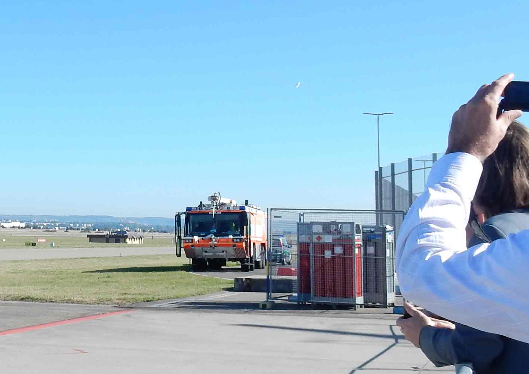 So sollte etwa der Feuerwehrtruck einerseits ganz nah bei allen möglichen Gefahrenbereichen positioniert sein, andererseits aber auch nicht im Weg stehen. Im Endeffekt versperrte er die Sicht auf den Start der HY4. Im Nachhinein konnte ich verstehen, dass die Verkehrsmangementverantwortlichen sich nicht auch noch überlegen wollten, wo sie ein weiteres Kleinflugzeug sicher hinstellen sollten.