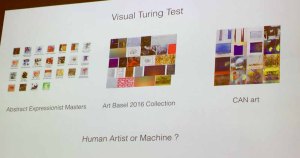 Der Direktor des Art und AI Laboratory fütterte seine lernende Software mit rund 100 Bildern anerkannter bildlicher Kunst aus Museen. Der Algorithmus steht dann im Spannungsfeld zwischen Veränderung (Kreativität) und Regeln (Was ist schön oder akzeptabel?).