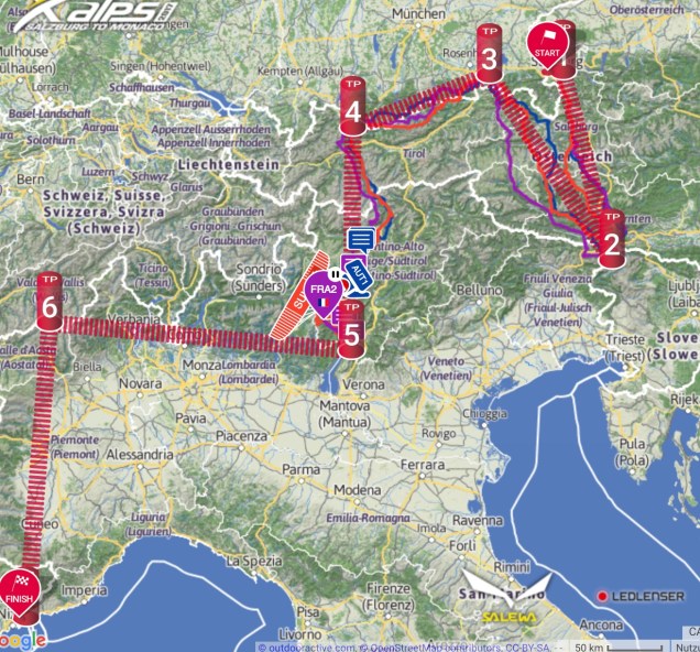 Von Salzburg ging es wegen extremem Schlechtwetters zunächst ausnahmslos zu Fuß nach Slowenien um den Triglav, drei Tage später sind die Besten, angeführt von Seriensieger Maurer, bereits am Chiemsee vorbei und am Weg zur Zugspitze in Deutschland unterwegs. Dann geht es wieder südlich zum Monte Baldo am Gardasee in Italien, vorbei am Matterhorn in der Schweiz entlang der französischen Seealpen bis zum Ziel in Monaco.
