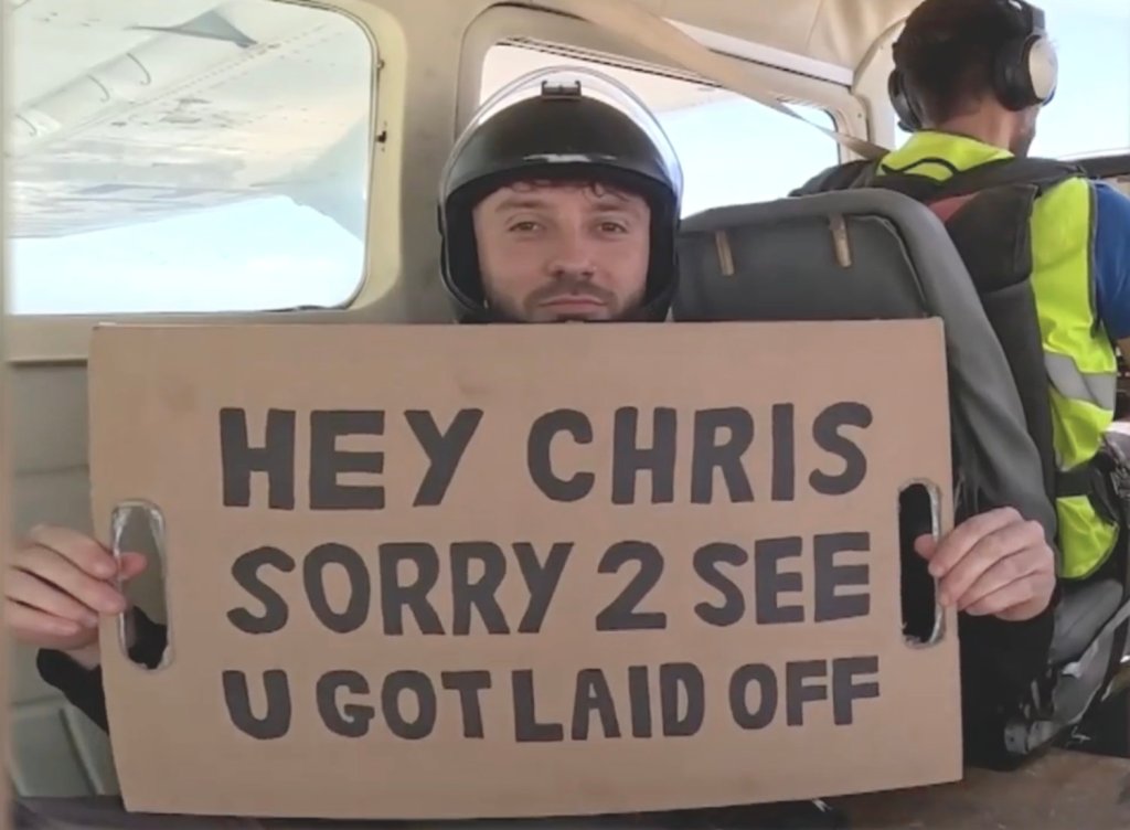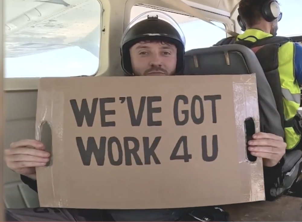 „Die Anzeige von Chris, mit der er sich um einen Job beworben hat, zeigt alles, was ich an kreativen Talenten schätze – sie ist kühn, wagemutig und zeigt, dass er mit Risiken im Leben umgehen kann,“ so Peagam. Und weil Jack Peagam zufälligerweise auch Freeflyer ist, flog er wetterbedingt von Manchester auf die Kanarischen Inseln und postete sein Jobangebot ebenfalls im Freifall.