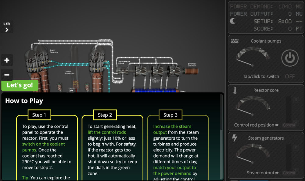 Reaktorfahrer ist ein anspruchsvoller Job. Hast Du das Zeug dazu, ein Kernkraftwerk zu bedienen? Dieser Simulator nimmt dich mit auf einen Rundgang durch ein virtuelles Kraftwerk, bevor er dir die Schlüssel zum Kontrollraum aushändigt. Stell dich der Herausforderung, genug Energie zu produzieren, um den Bedarf zu decken und gleichzeitig eine Kernschmelze zu vermeiden.